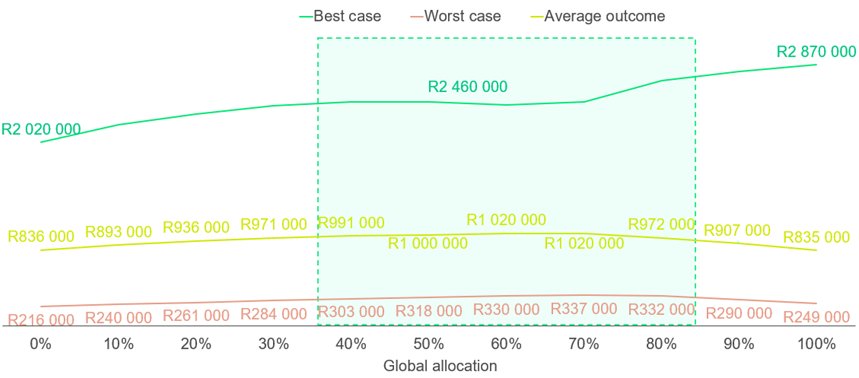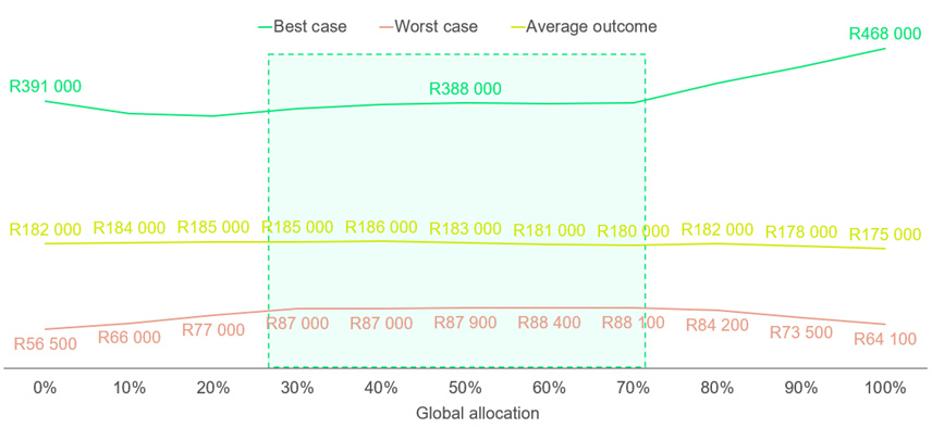Leonard, a 10-year investor, sees similar average outcomes across all global allocations (yellow line in chart below). But in the worst-case scenarios, extreme allocations (very little or too much global) perform poorly. A 30% to 70% global allocation is optimal as it offers better downside protection.