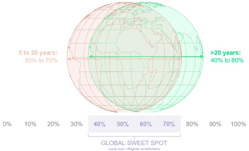 These are just two lump sum case studies from our research. Here’s what the research tells us. The optimal global allocation for both lump sum investments and regular contributions by investment horizon is: